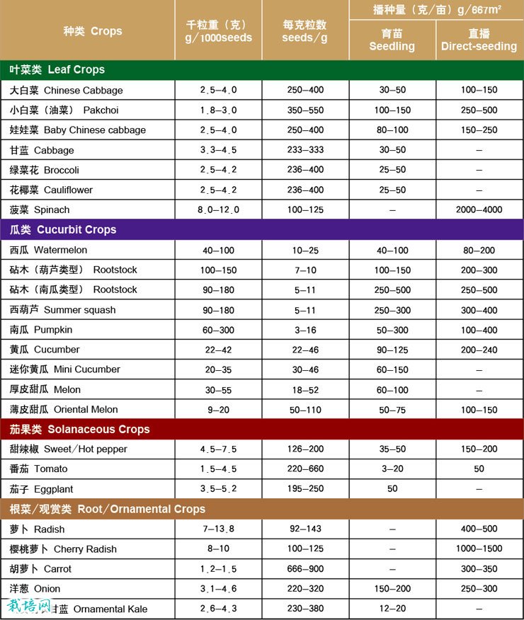 主要蔬菜作物种子千粒重与亩用种量 | ||||